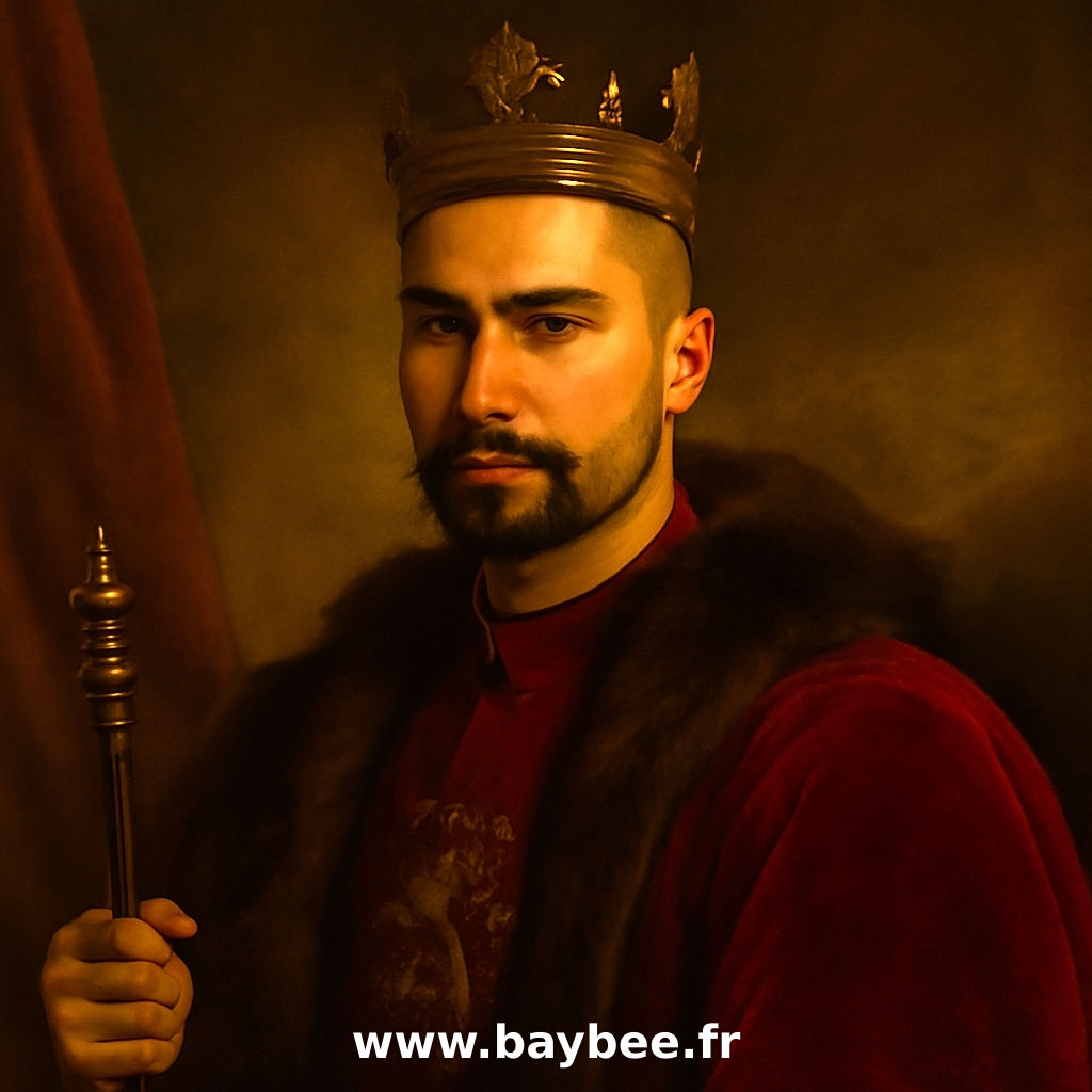 • A close-up photo of a wide-eyed baby wearing a golden paper crown, looking curiously at the camera with a bit of drool on the chin, set indoors with a cozy background featuring shelves and a yellow chair.