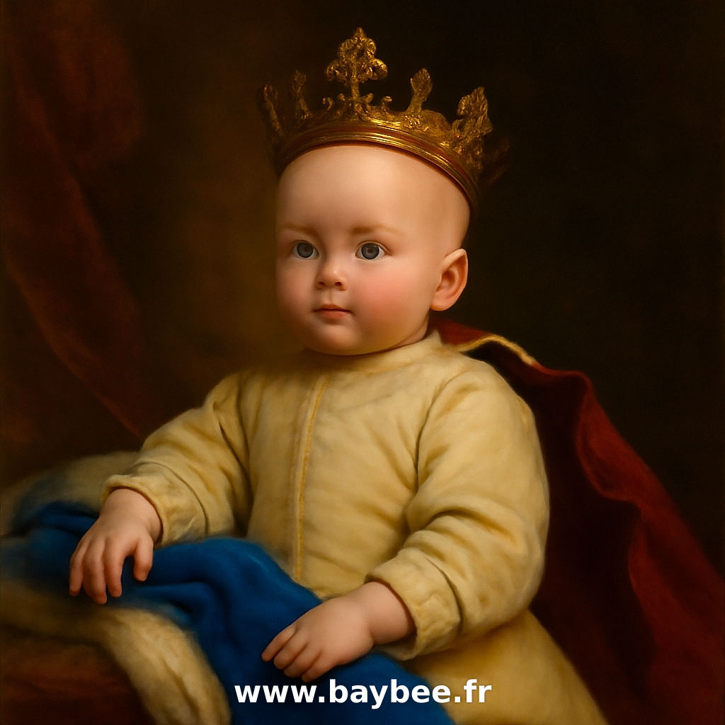 • A curious toddler with bright blue eyes sits on a soft pink rug, looking up with an innocent expression while wearing a striped shirt and shiny black shoes. Behind, a stroller and a crib hint at a cozy nursery setting. A red heart emoji overlays the bottom part of the image, adding a touch of love.