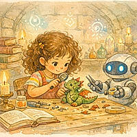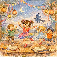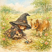 Thaïs prend la main de Loup. Loup montre ses dents mais pas pour mordre. Thaïs commence une danse magique. Ses pas forment de petites lumières dans l’herbe. Le sorcier s’arrête et observe.